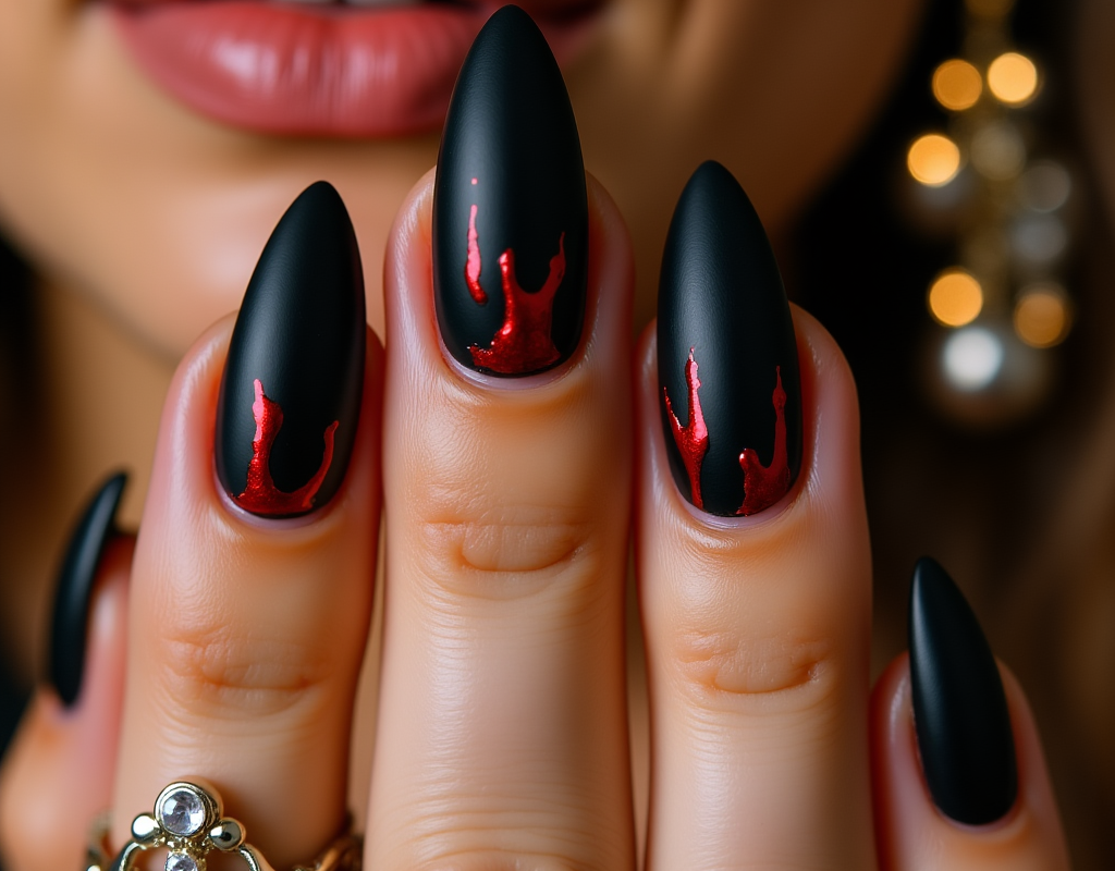 For the bold and daring, these dramatic matte black stiletto nails feature striking metallic red drip accents. An edgy, glamorous take on holiday nails that’s perfect for evening parties and making a statement.
